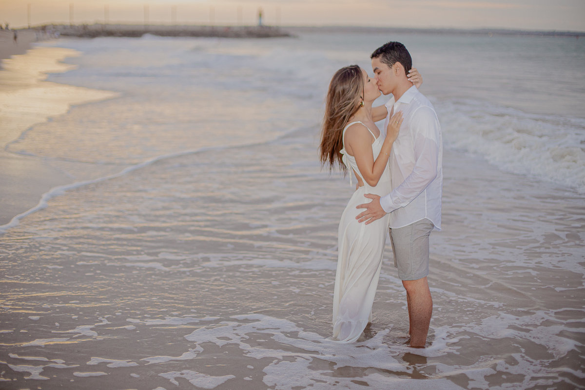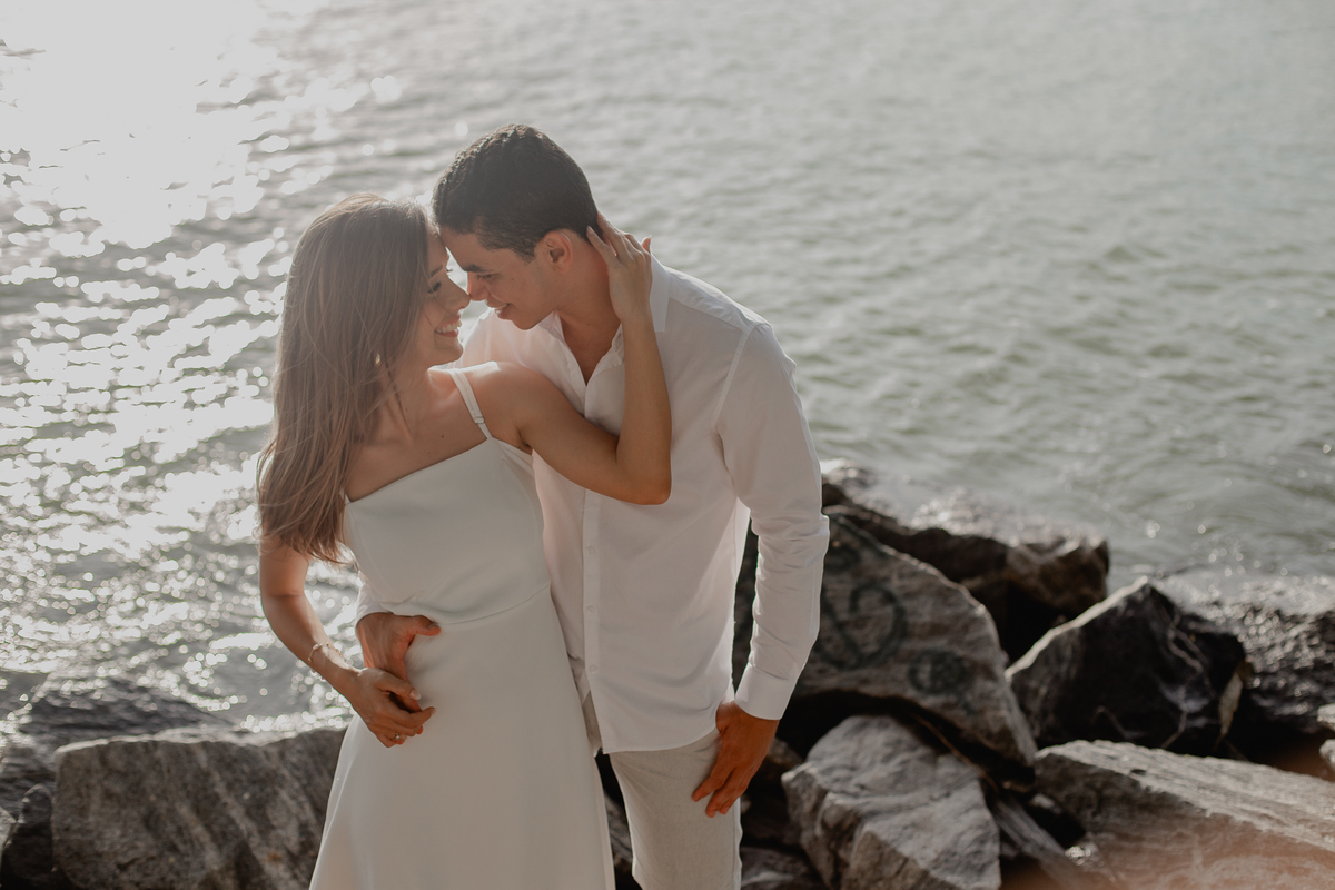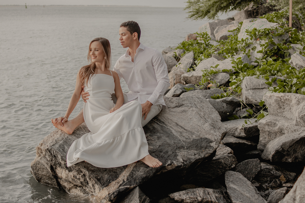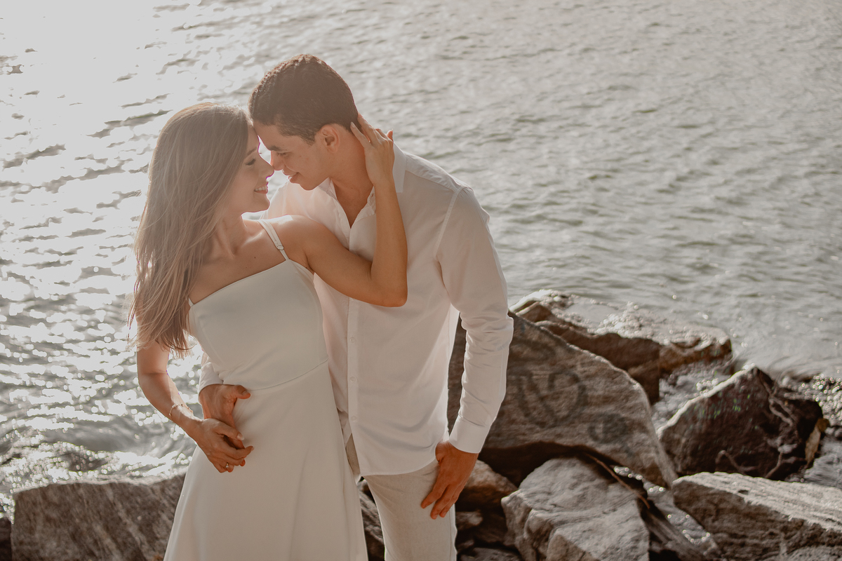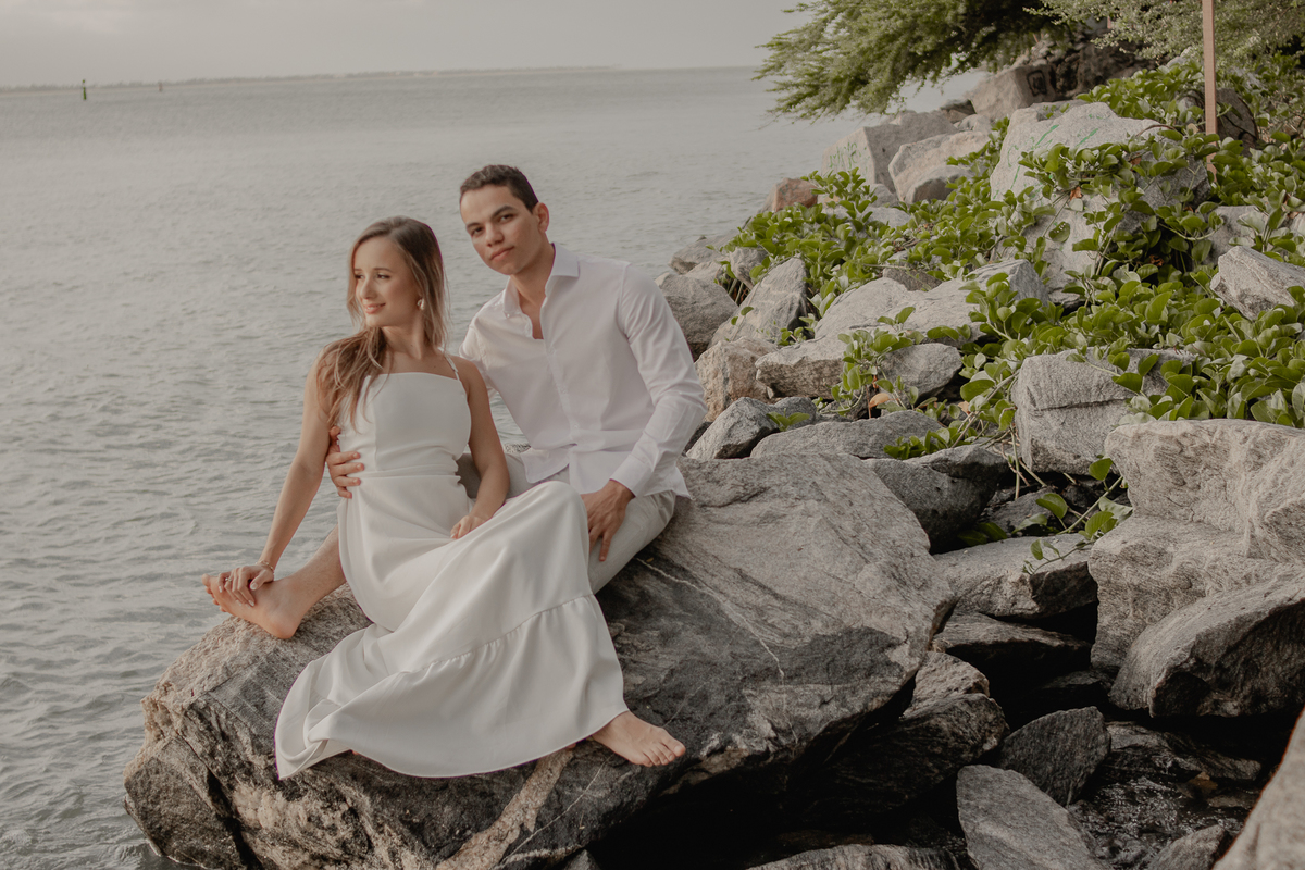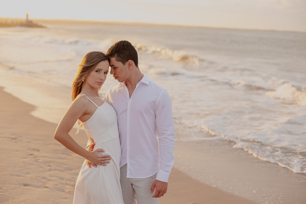A brisa leve, o som do mar e a imensidão do horizonte criam o cenário perfeito para registrar todo o amor e a sintonia do casal.