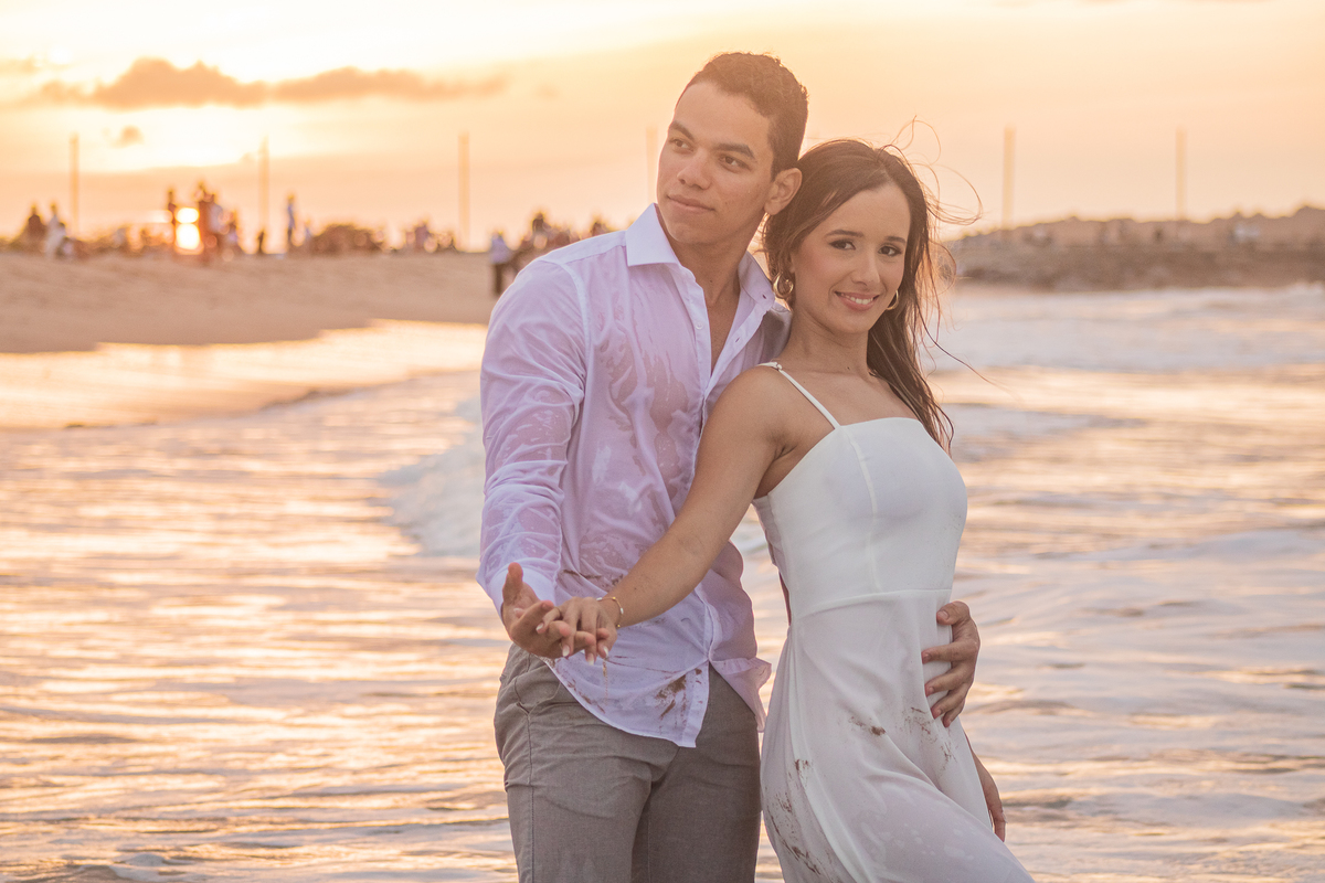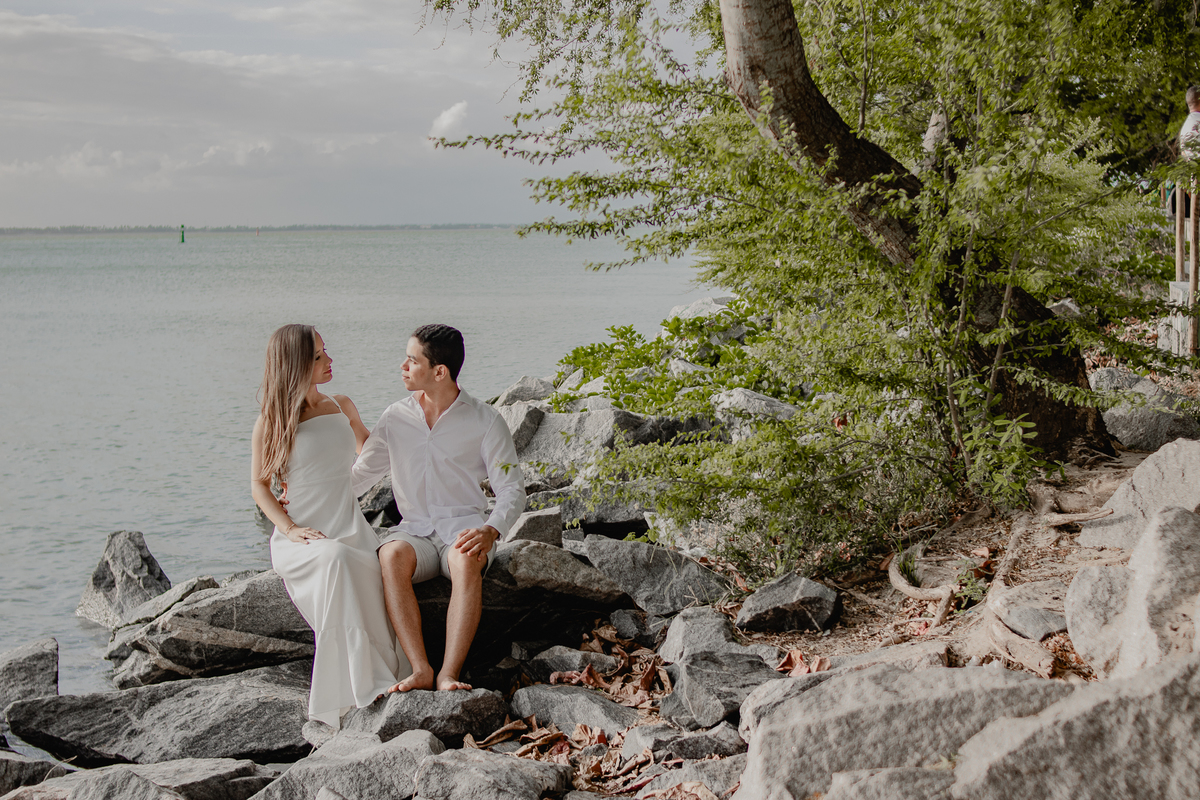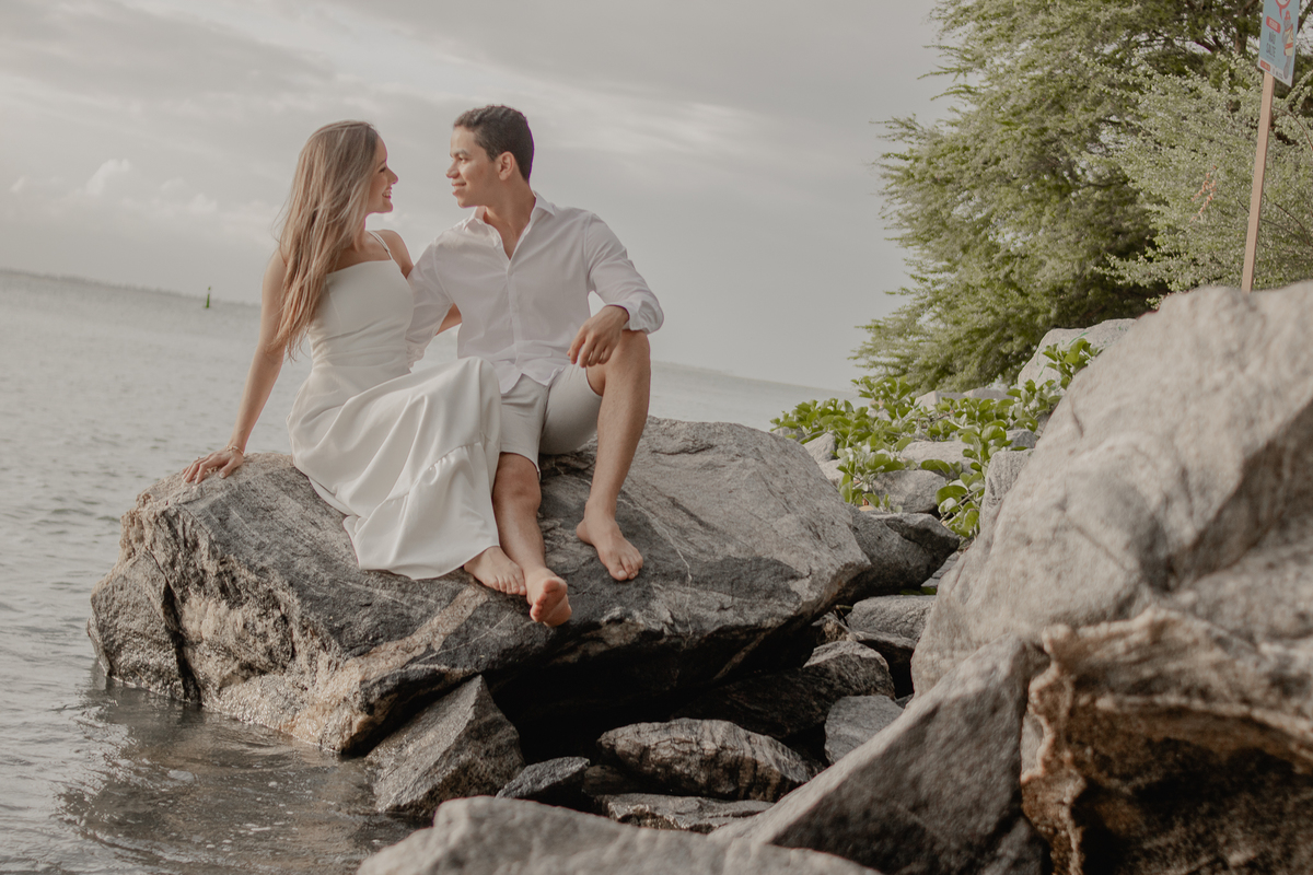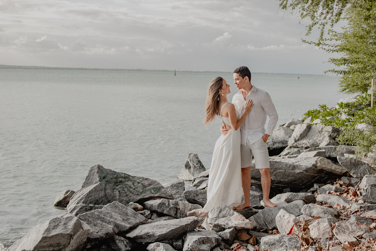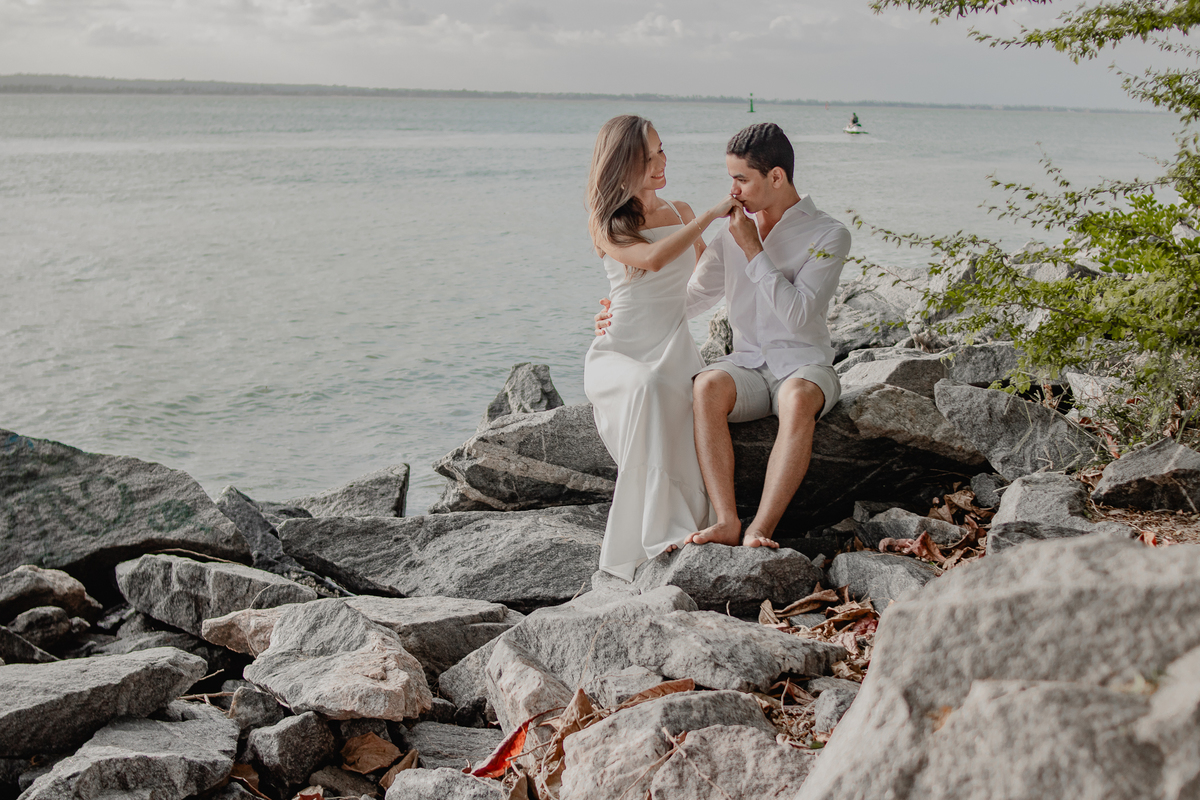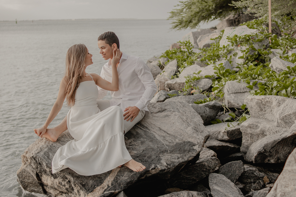 A brisa leve, o som do mar e a imensidão do horizonte criam o cenário perfeito para registrar todo o amor e a sintonia do casal.