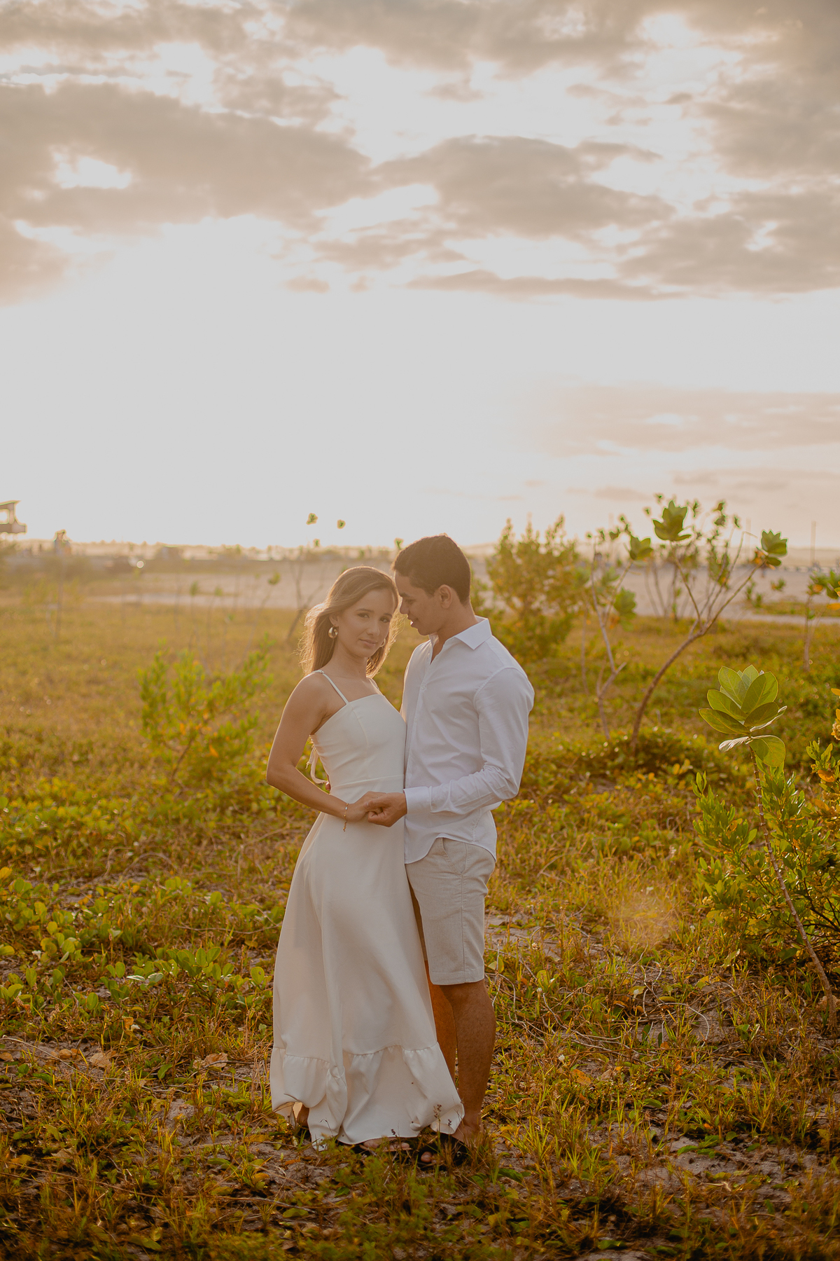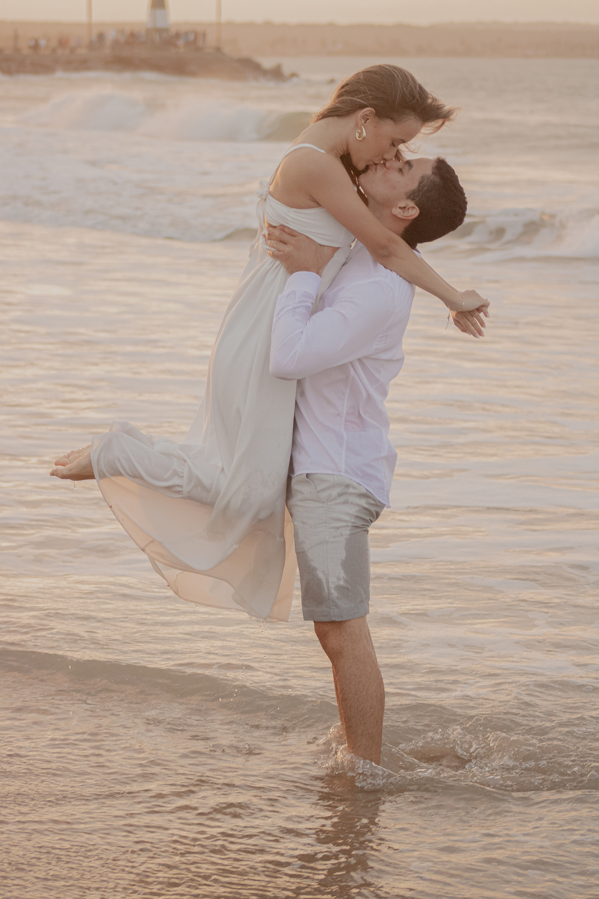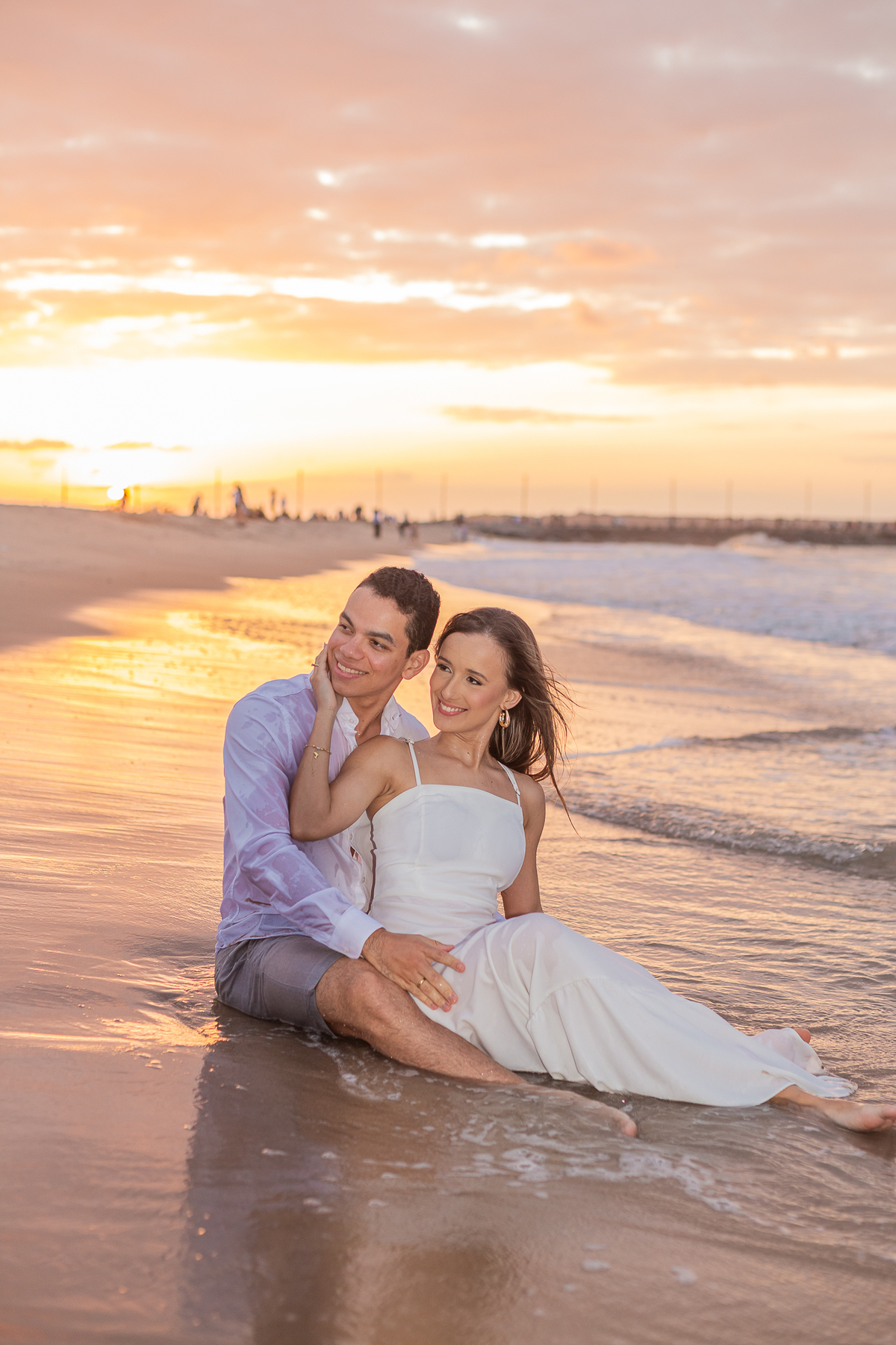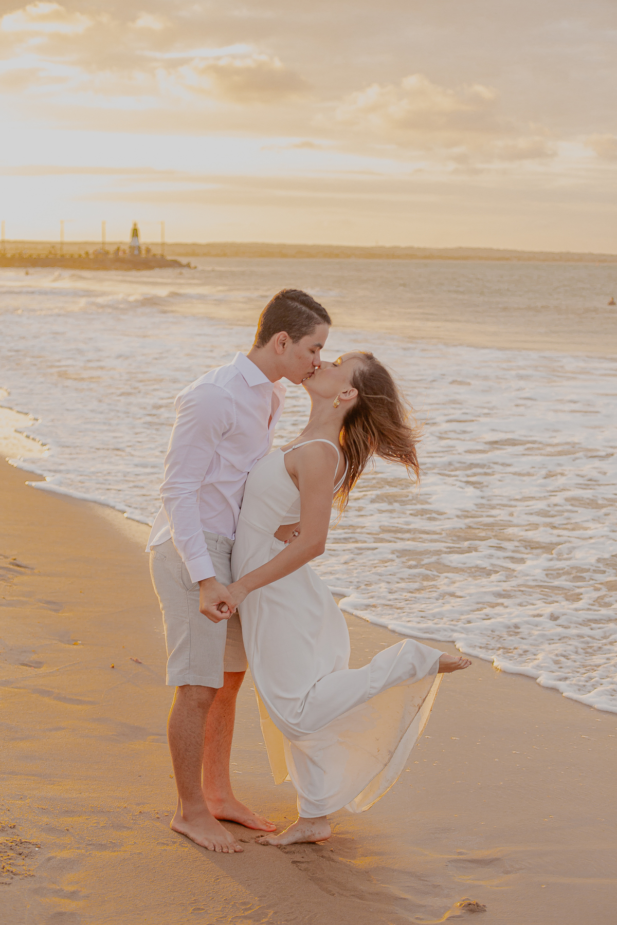 A luz natural do pôr do sol refletindo no mar deixa tudo ainda mais romântico, como se o universo inteiro conspirasse para eternizar esse momento.