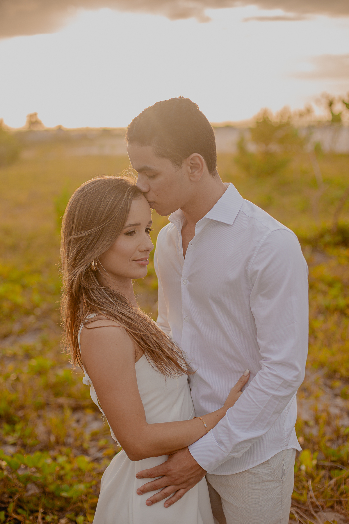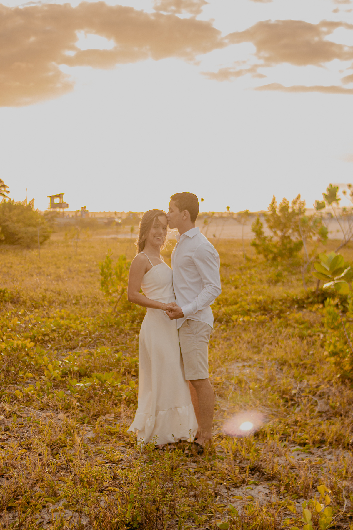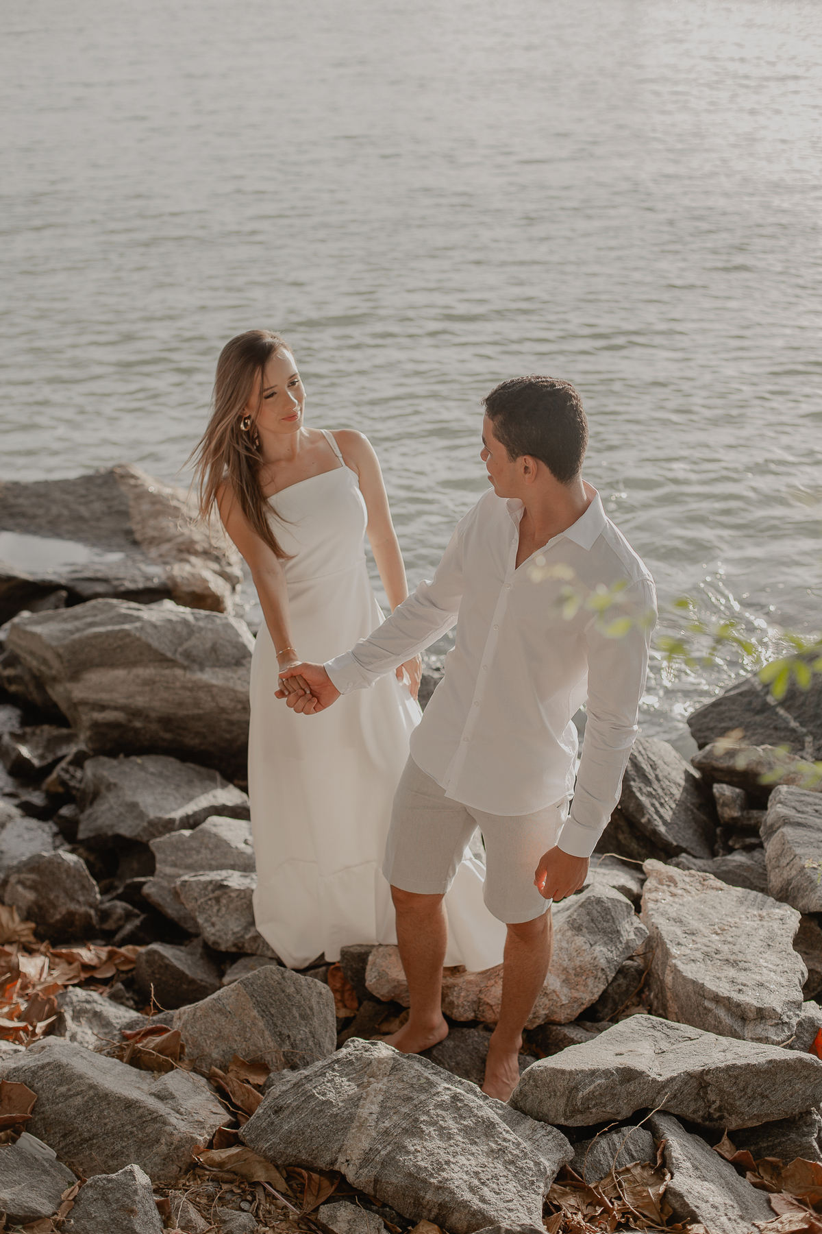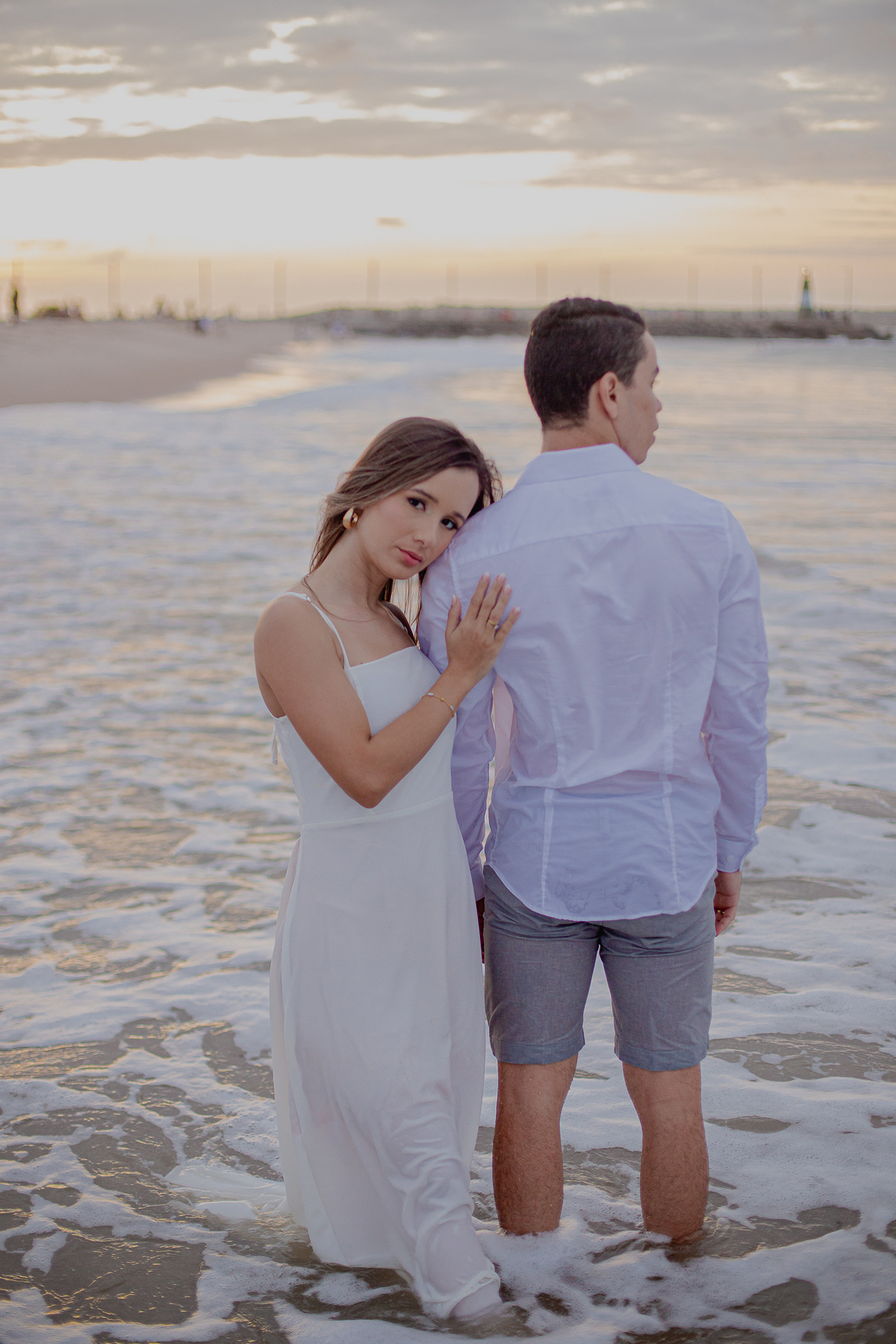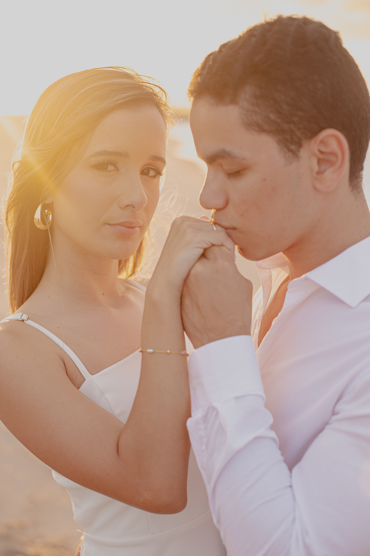 A luz natural do pôr do sol refletindo no mar deixa tudo ainda mais romântico, como se o universo inteiro conspirasse para eternizar esse momento.
