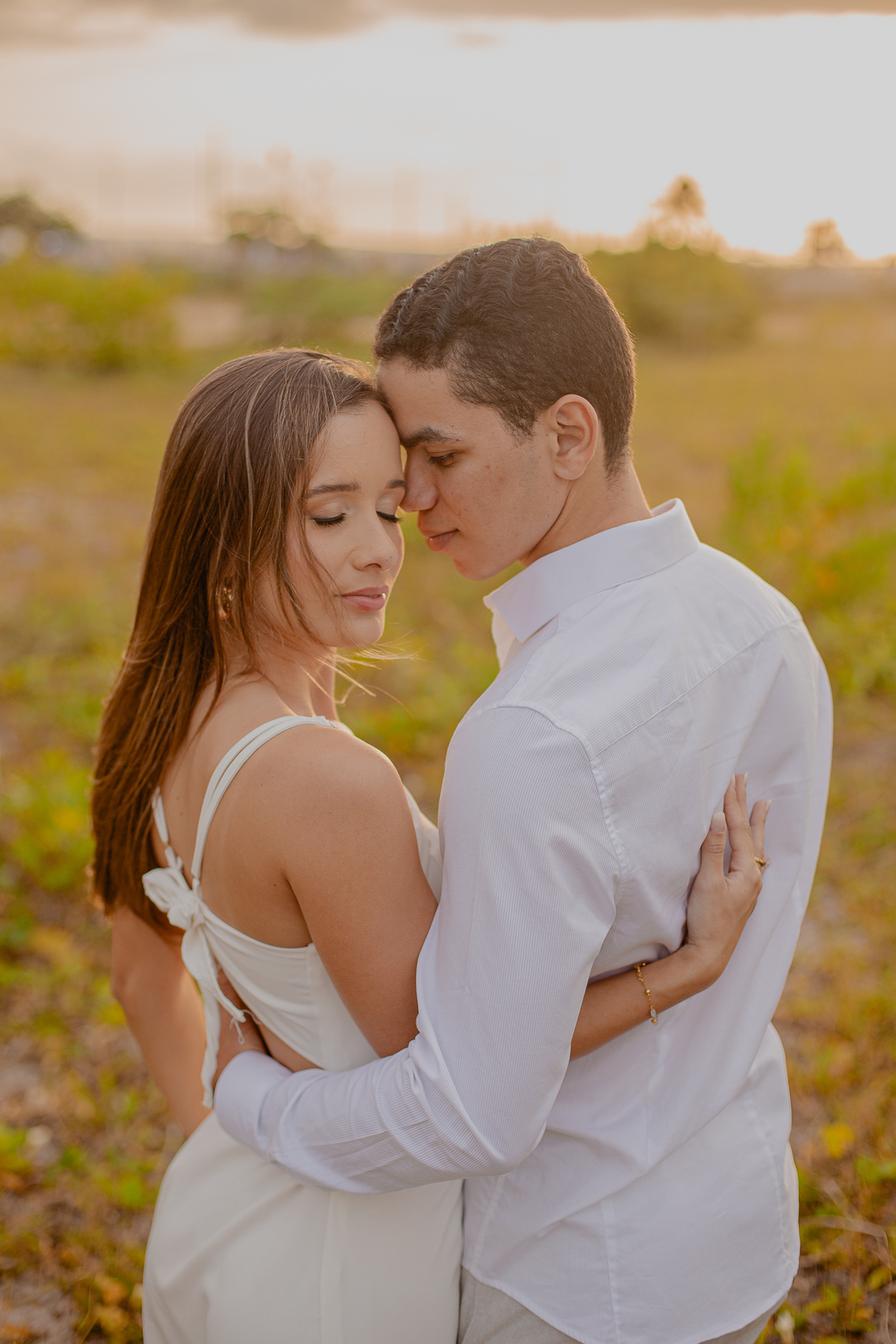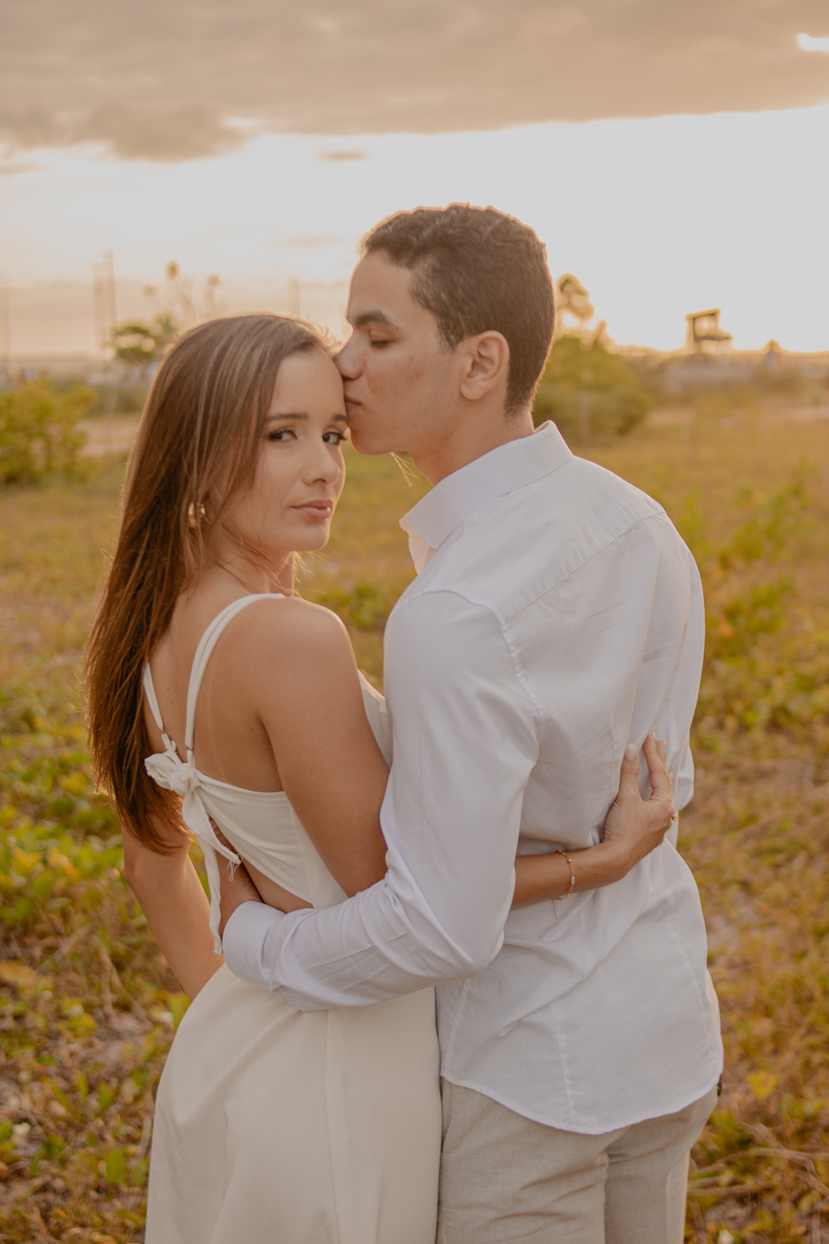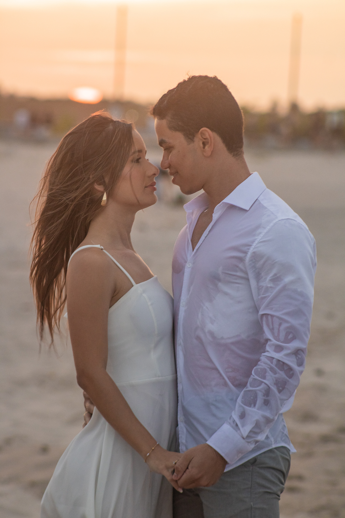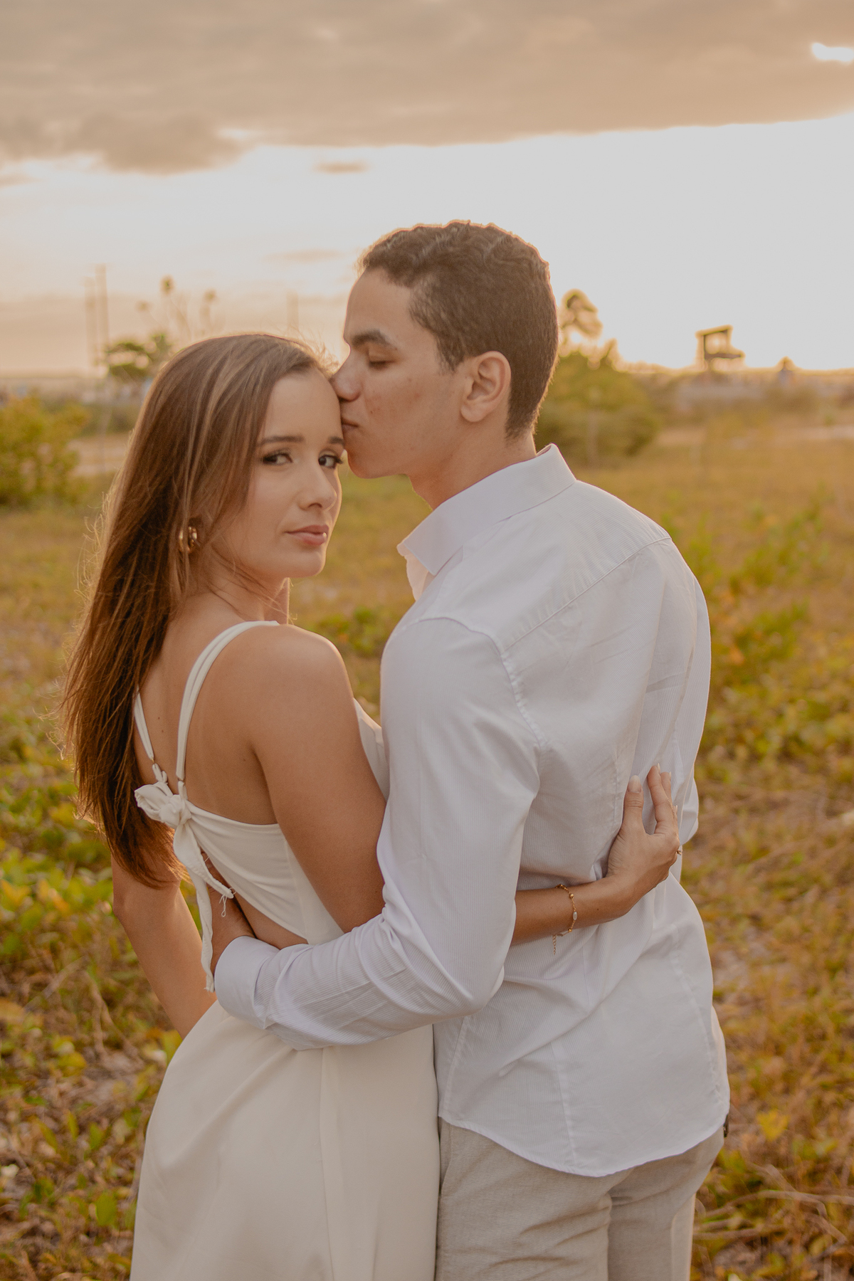 A luz natural do pôr do sol refletindo no mar deixa tudo ainda mais romântico, como se o universo inteiro conspirasse para eternizar esse momento.